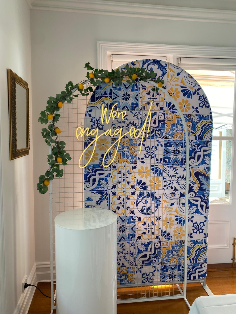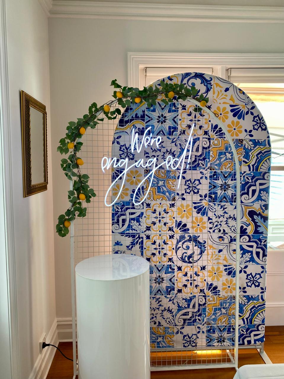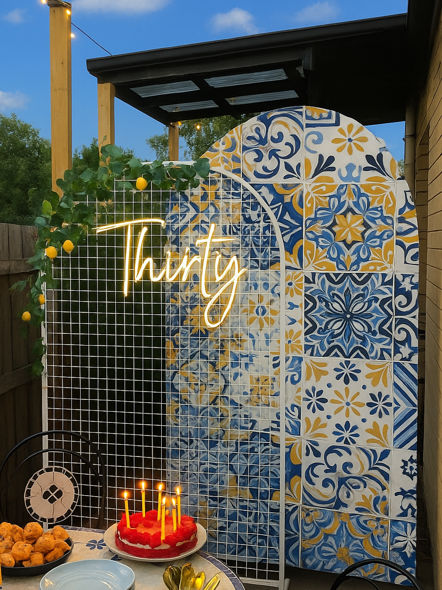 Bring a touch of the Amalfi Coast to your celebration with this vibrant blue, yellow, and white tiled backdrop, paired with a matching mesh frame, lemon garland, and neon sign of your choice - perfect for birthdays, engagements, or long-table dinners with a luxe summer vibe.
